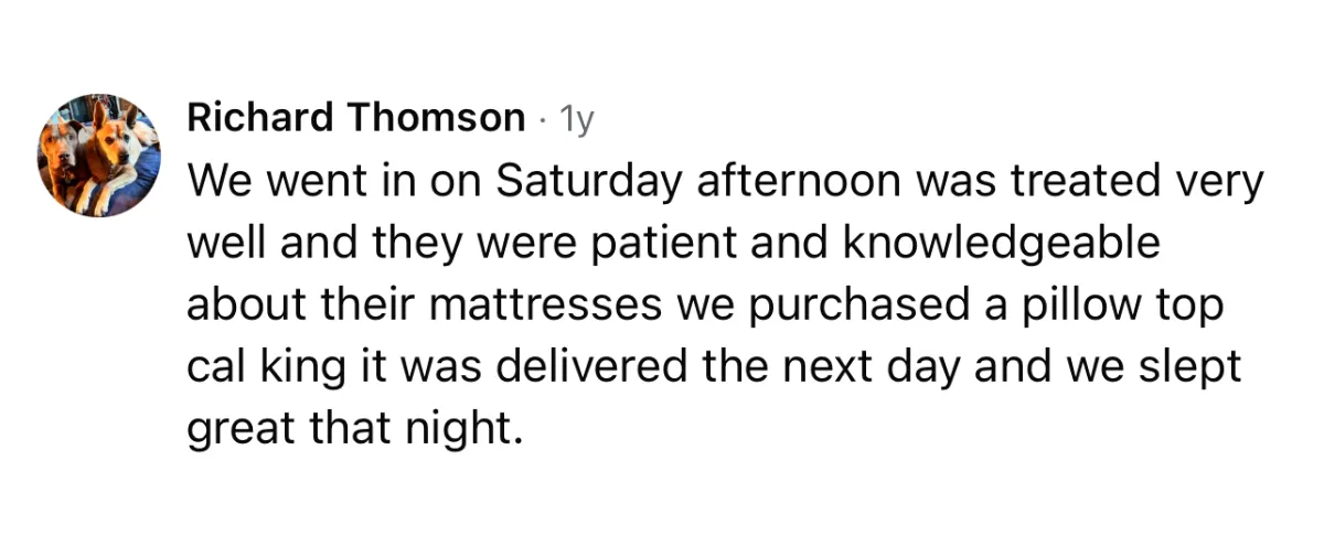 As a small, family-owned mattress business based in Lodi, CA, we’re big on personalized service. We take the time to understand what you’re looking for and help you choose the mattress that fits your needs and budget, so you leave happy, comfortable, and confident you got a deal that actually makes sense.